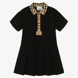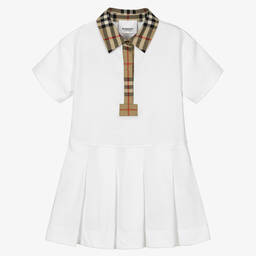 White polo dress for baby girls by luxury British brand Burberry, with the designer's archival Vintage check trims. Made in comfortable cotton piqué, it fastens with faux tortoiseshell logo buttons on the placket and has a flippy box-pleated skirt. Around the back is a beige rubberised badge with a statement white Horseferry logo.