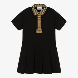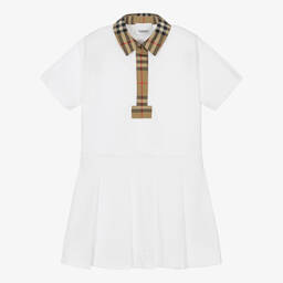 White polo dress for girls by luxury British brand Burberry, with the designer's archival Vintage check trims. Made in comfortable cotton piqué, it fastens with faux tortoiseshell logo buttons on the placket and has a flippy box-pleated skirt. Around the back is a beige rubberised badge with a statement white Horseferry logo.