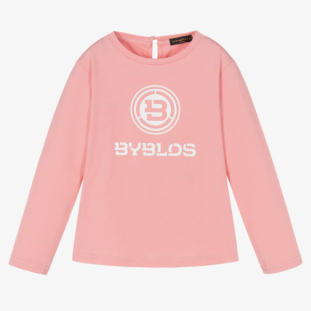 Pink long-sleeved top for girls by Italian brand Byblos, with a white rubberised B logo printed on the front. Easy and comfortable to wear. it is made in soft cotton jersey.