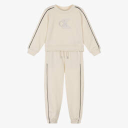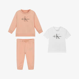 Pale pink organic cotton tracksuit and T-shirt gift set for baby girls by American lifestyle brand Calvin Klein. Made in soft, comfortable jersey, the sweatshirt has a contrasting pink and black monogram logo printed on the front, cosy, ribbed trims and useful popper fastenings on one shoulder. The joggers have a drawstring waist for a great fit, a small monogram logo on one side and elasticated cuffs. It comes with a white, organic cotton T-shirt with a grey monogram logo and popper fastenings on one shoulder. This set is made with at least 50% certified organic cotton.