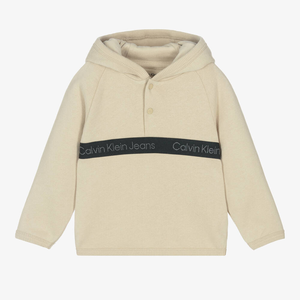 Beige hooded top for little boys and girls by Calvin Klein, with a black logo tape trim across the chest for a cool contemporary look. This long-sleeved top is made in soft cotton jersey with a cosy fleecy interior and ribbed trims. To help with dressing, it fastens with CK monogram embossed poppers on the front. This top is made with at least 95% certified organic cotton.