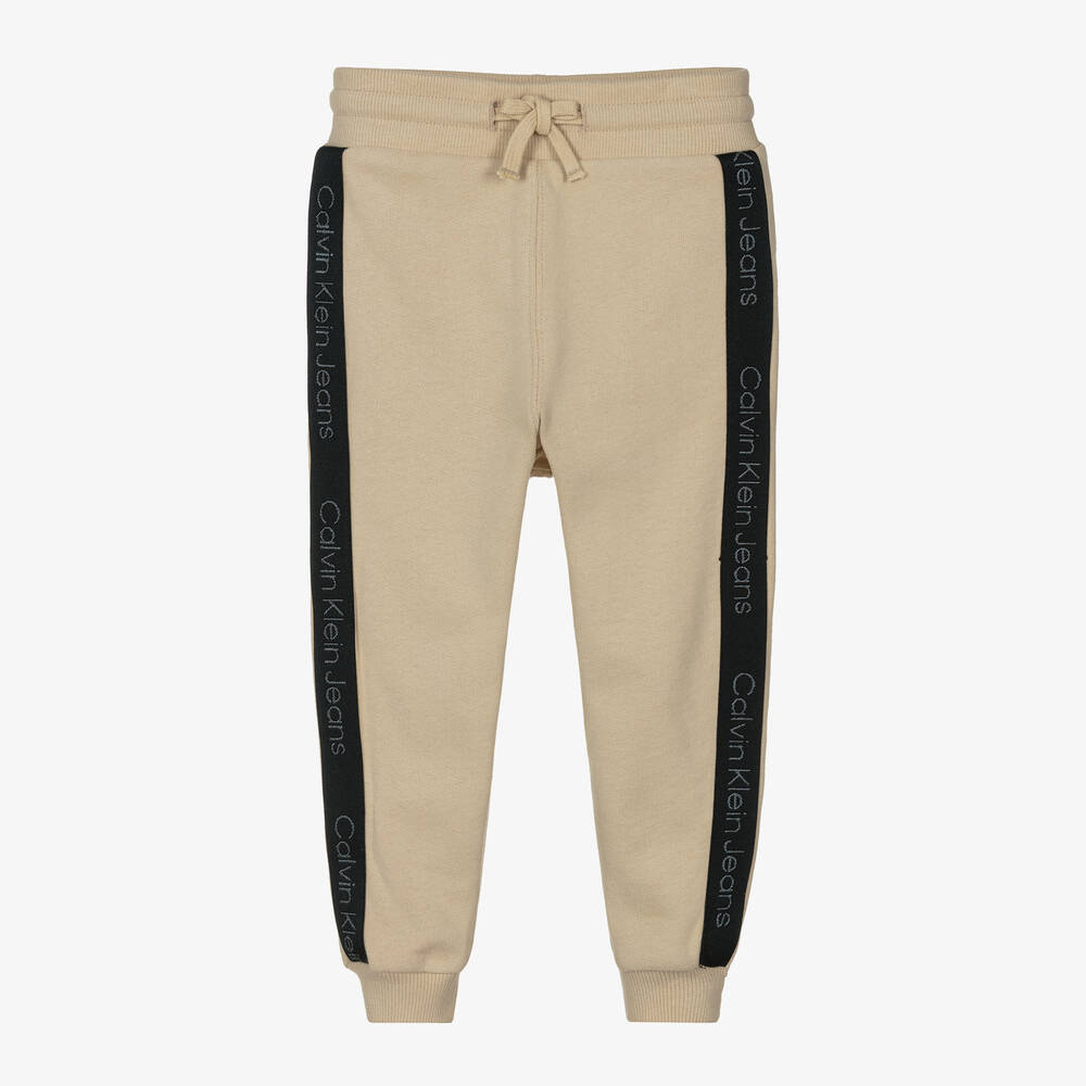 Beige joggers for little boys and girls by Calvin Klein, made from soft mid-weight cotton jersey with a cosy fleecy interior. There are black Calvin Klein logo tape trims down the side of each leg for a cool branded look. Comfortable to wear, they have stretchy ribbed cuffs and an elasticated drawstring waistband for a comfortable fit. Made with at least 95% organic cotton.