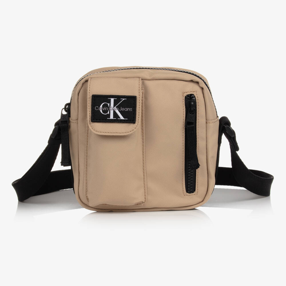 Beige crossbody bag for boys and girls by Calvin Klein Jeans, made in durable recycled canvas. The main compartment fastens with a zip. There is a small zip fastening pocket on the front and a velcro fastening pocket with a black, white and grey logo patch. The black strap is adjustable to ensure the bag fits neatly across the body.
