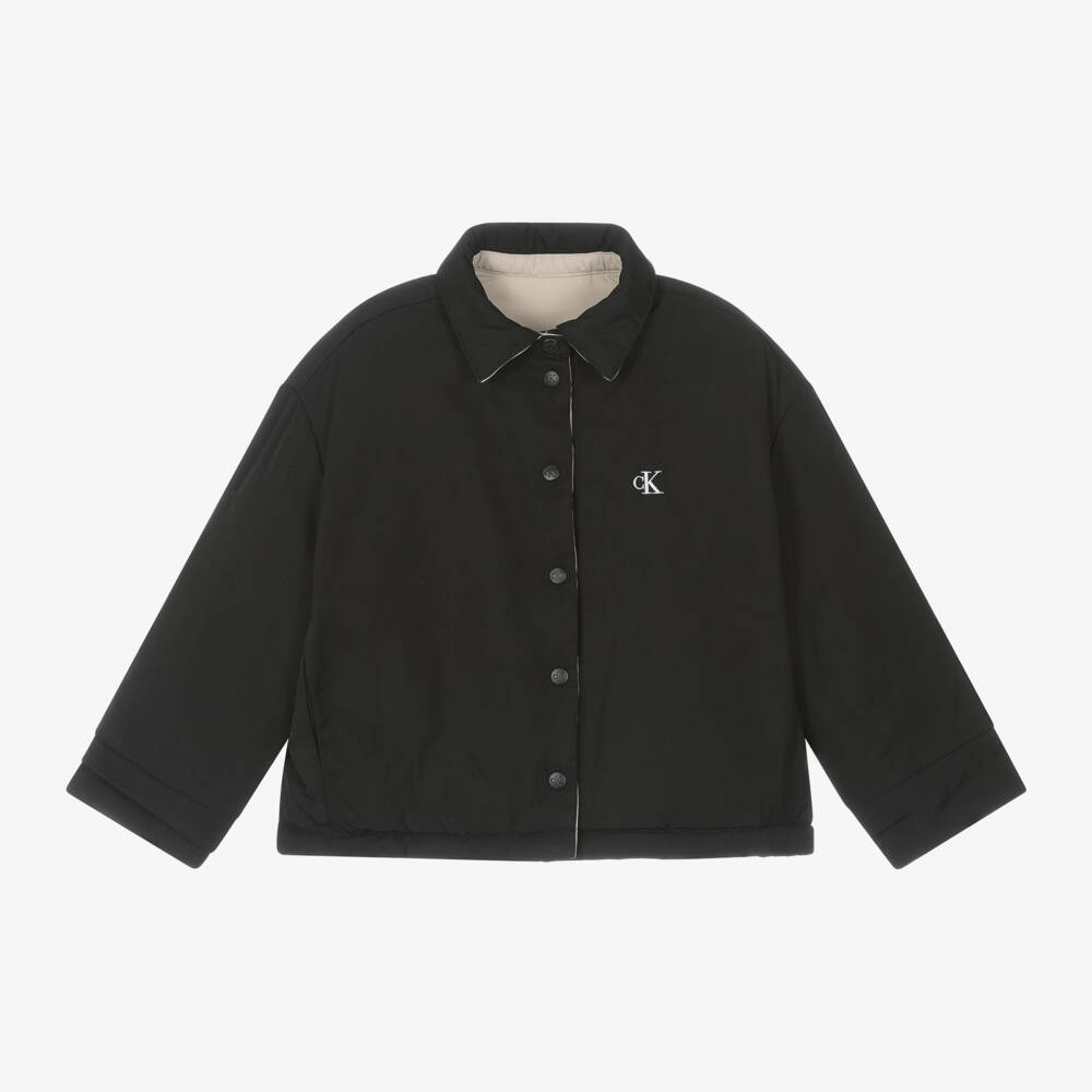 Black and beige reversible jacket for boys and girls by Calvin Klein, made in soft and smooth fabric. Lightly padded for warmth. this versatile jacket has logo popper fastenings and both sides have useful front pockets. The black side has a white CK logo embroidered on the chest and a large grey and white Calvin Klein monogram logo printed on the back for an instant designer statement. The beige side has a black, white and grey monogram logo patch on the chest. This item contains at least 95% recycled material.