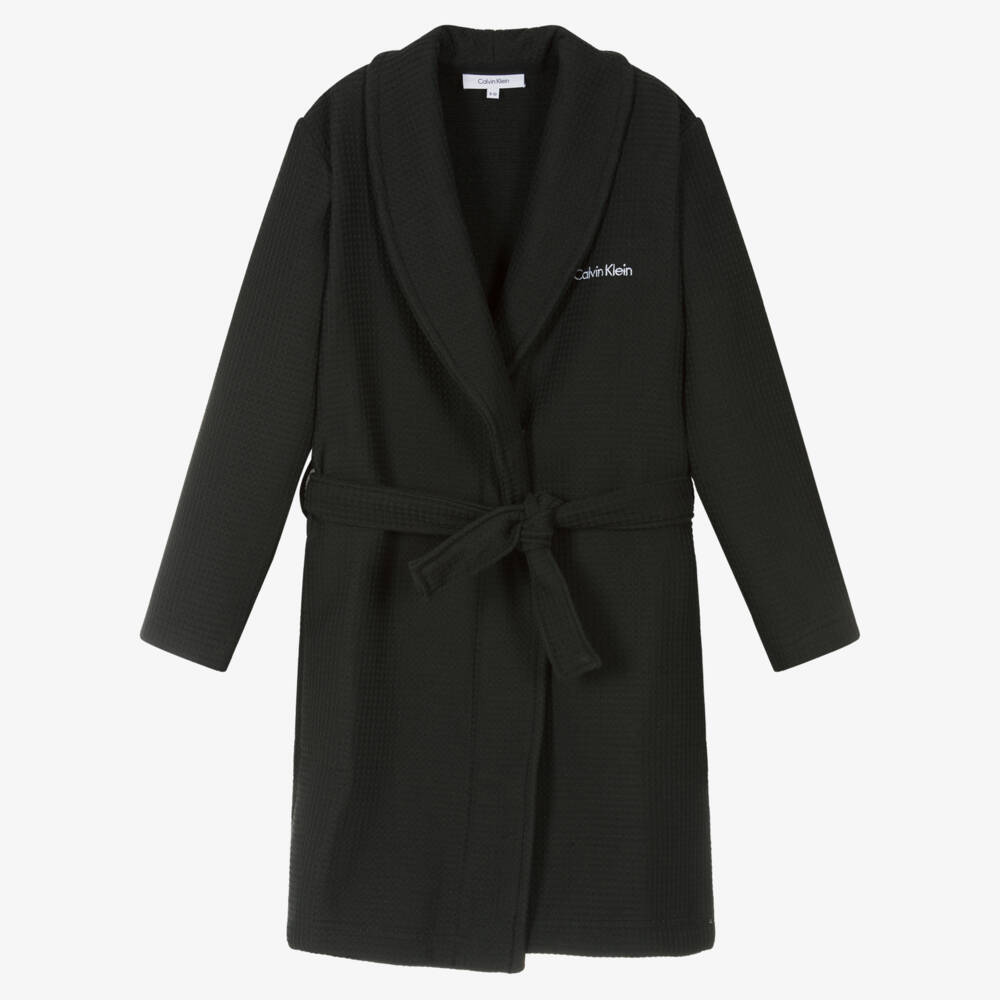 Black cotton dressing gown for boys and girls by Calvin Klein, made from soft, mid-weight waffle jersey. In a comfortable wrap-around design, it has a removable tie belt and for designer appeal, an embroidered white logo on the chest.