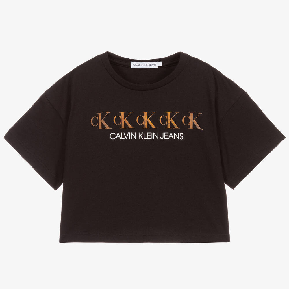 Black T-shirt for girls by Calvin Klein Jeans. Made with soft and stretchy organic cotton jersey, this boxy top has the designer's signature logo in white and shimmering gold foil.