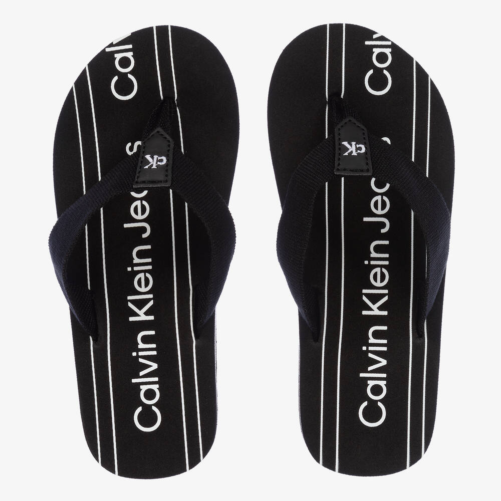 Black flip-flops for boys and girls by Calvin Klein Jeans, made in EVA foam for comfort. The textured outer sole improves grip on wet or slippery surfaces. With woven straps for durability, they are finished with the iconic CK monogram logo for a designer touch.