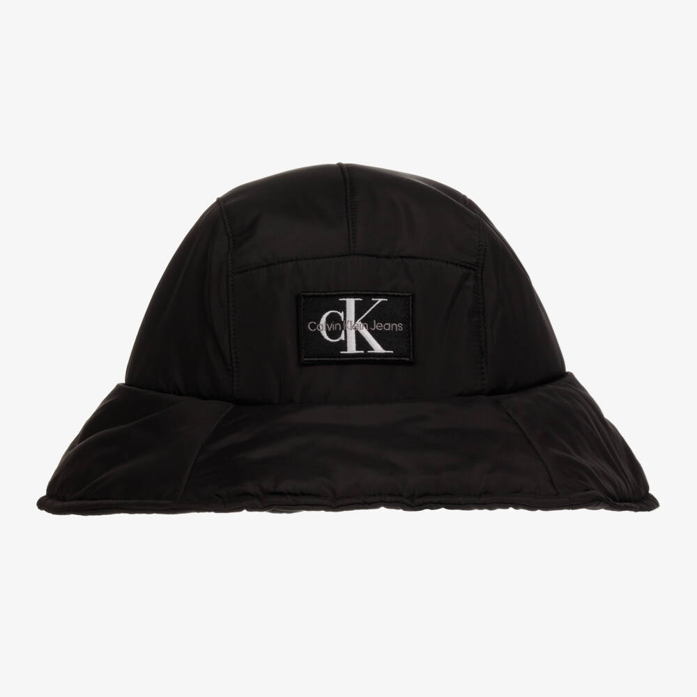 A black quilted bucket hat for boys and girls, by Calvin Klein Jeans. For a cool streetwear style, this hat features a Calvin Klein monogram patch on the front. Made in a smooth recycled fabric, it is designed to offer warmth and comfort.