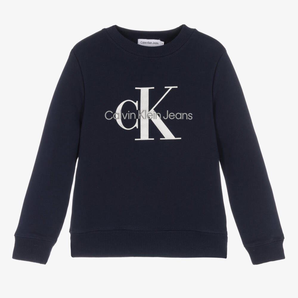 Navy blue sweatshirt for little boys and girls by Calvin Klein Jeans, made in mid-weight cotton jersey. Soft and comfortable to wear, it features the distinctive Calvin Klein monogram branding across the front in silver and grey.