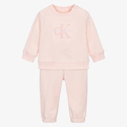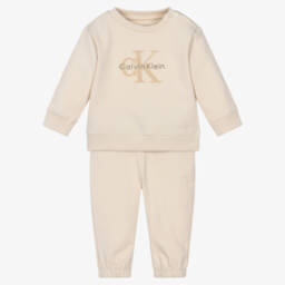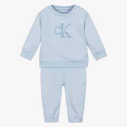 Cute blue tracksuit for little boys by Calvin Klein, made in soft cotton jersey. Casual and comfortable, the sweatshirt has cosy ribbed trims and a tonal bouclé and white embroidered CK monogram logo on the front. It has useful popper fastenings on one shoulder to help with dressing. The joggers have a pocket on the back and a drawstring waist for a great fit.