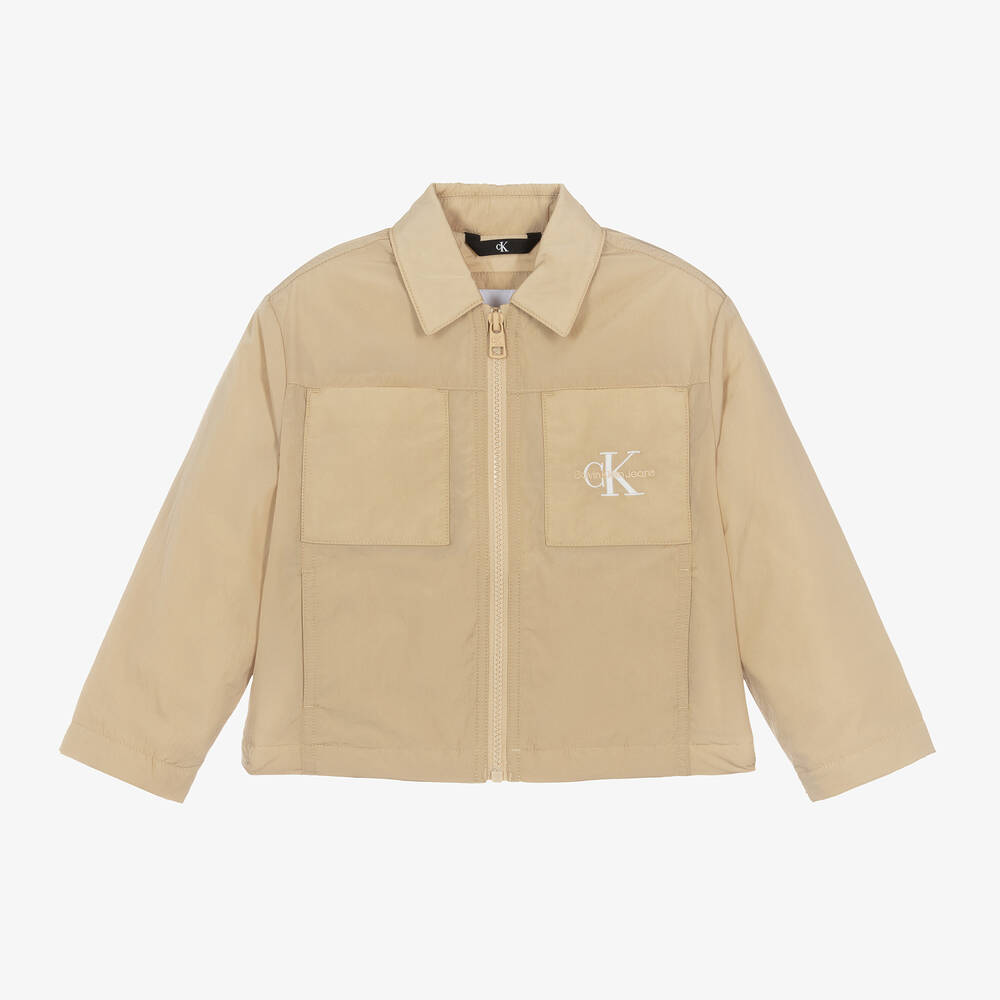 Boys beige jacket by Calvin Klein, made in silky fabric with gentle padding. Great as a lightweight layer, this overshirt-style jacket has a front zip fastening, a collared neckline and a silky smooth lining. There are two hidden slip pockets, in addition to the two patch pockets positioned on the chest. The Calvin Klein Jeans logo is embroidered on the front for a branded look. The outer material is made with at least 95% recycled material.