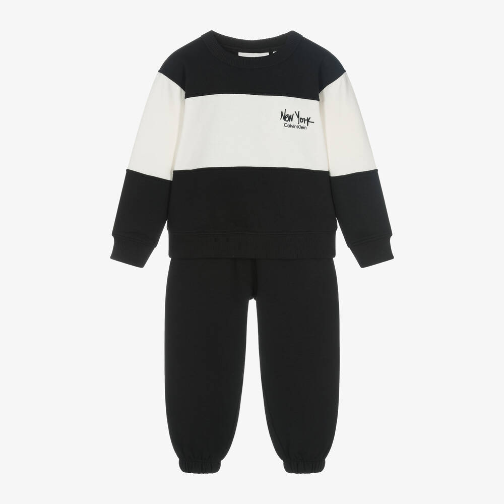 Black and ivory tracksuit for boys by Calvin Klein, cosy for everyday casual wear. In a comfortable relaxed fit, this casual pairing is made in cotton-blend jersey with a soft fleece underside and ribbed trims. The colourblock sweatshirt has the brand's New York logo embroidered on the chest. The joggers have three pockets, elasticated cuffs and waistband with an adjustable drawstring for a good fit.