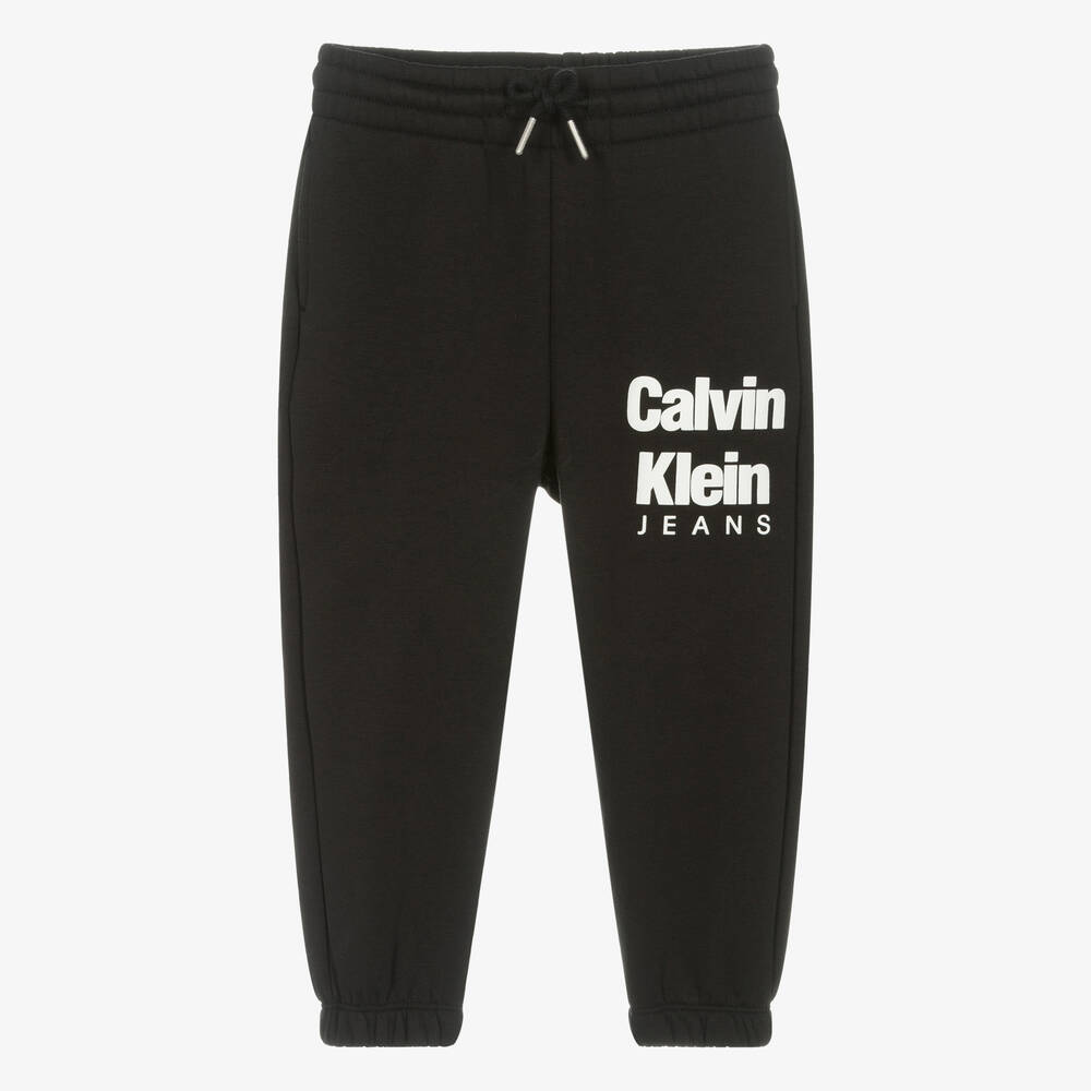 Boys black joggers by Calvin Klein, with a bold white logo printed on one leg. Comfortable for everyday casual, they are made in mid-weight cotton blend jersey with a soft fleecy underside and stretchy ankle cuffs. There is a patch pocket on the back and logo embossed silver tips on the adjustable drawstring.