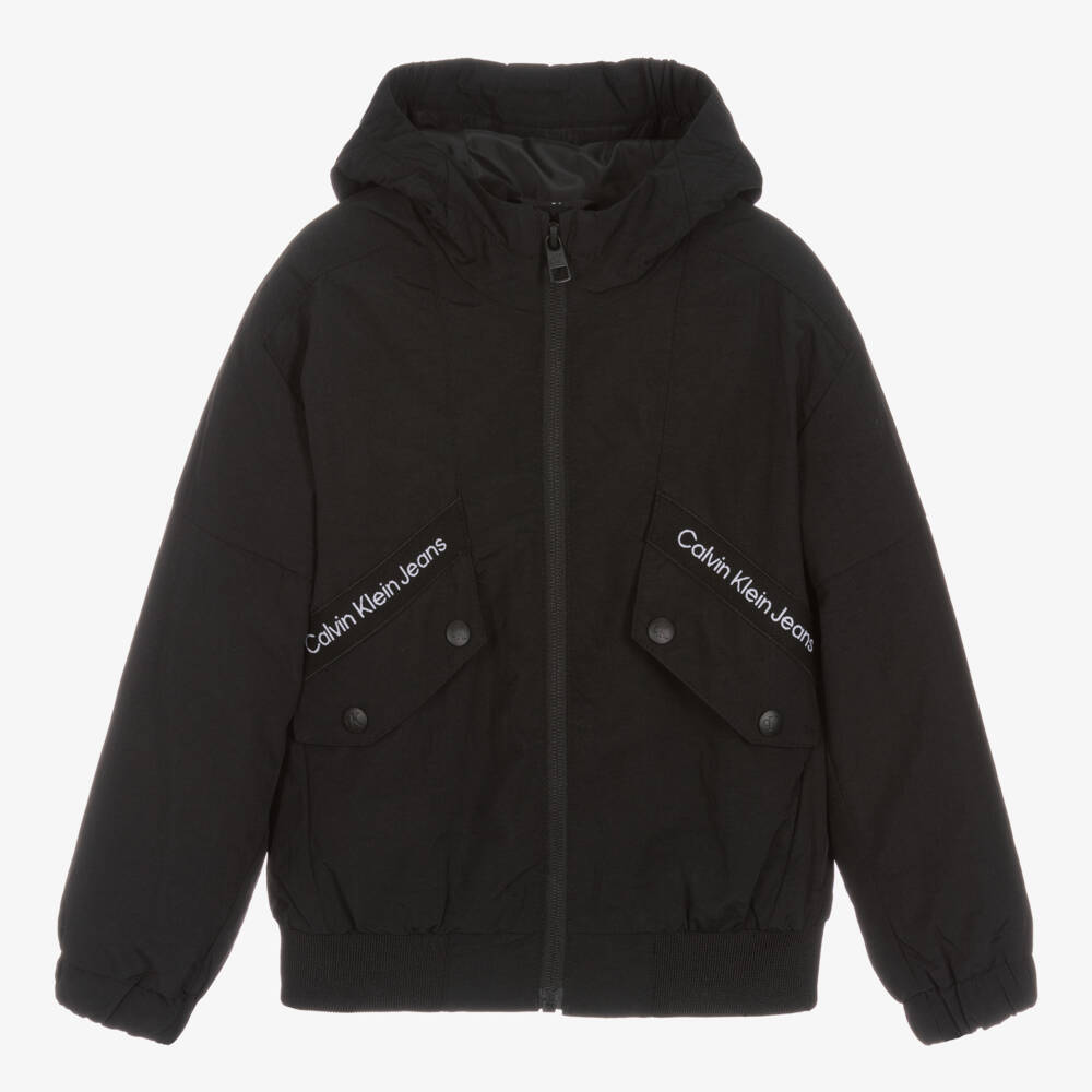 Black hooded jacket for boys by American designer Calvin Klein Jeans. Lightweight, it has logo-embossed, popper-fastening chest pockets with logo tape above, matching the logo tape on the hood. The exposed zip fastening has a logo pull tab and the silky black lining has a white logo printed in the centre.