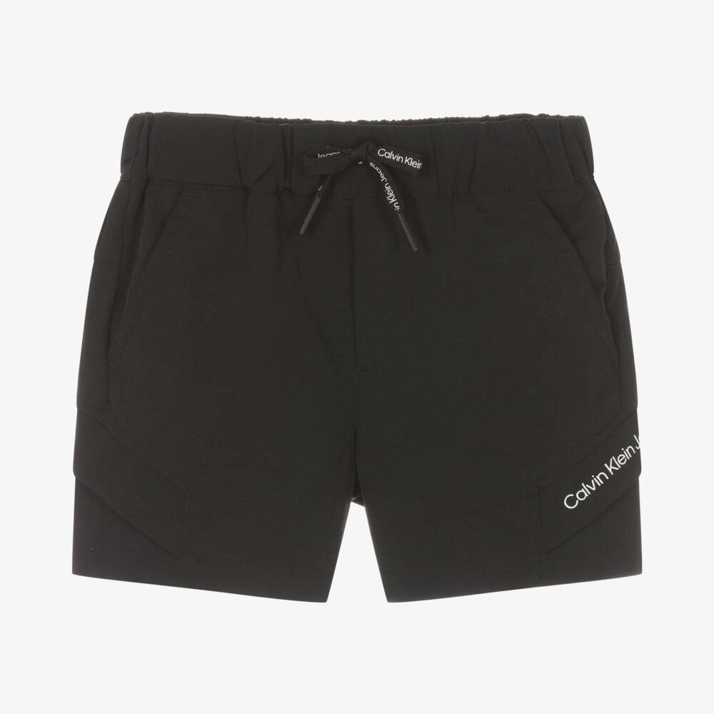 Black shorts for boys by American designer Calvin Klein Jeans. Lightweight, they have a comfortable, elasticated waistband with a logo drawstring for a good fit, useful front and back pockets and side panels on the legs, one printed with a white logo.