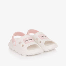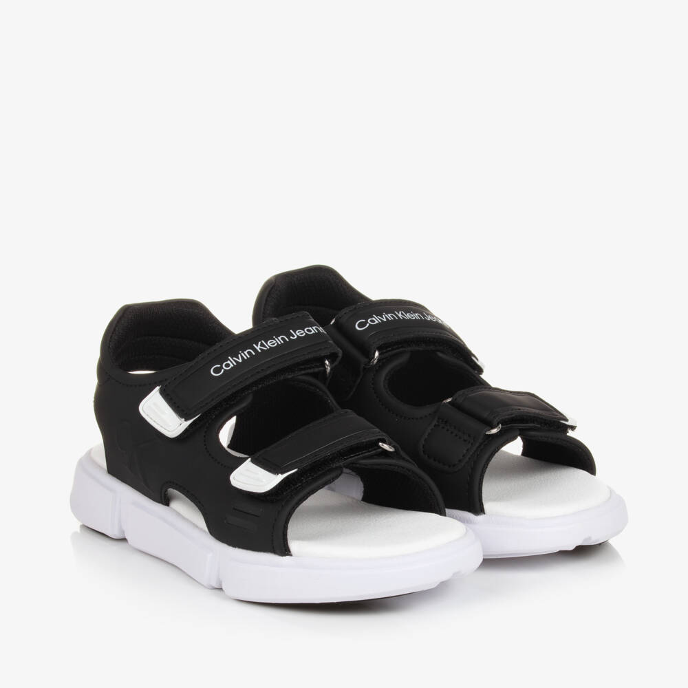 Black sandals for boys by Calvin Klein with contrasting white logos printed across the front. In a cool and easy-to-wear style, they are made from smooth rubber with mesh lining and a comfortable padded faux leather insole. Fastening with practical velcro straps, they have a white non-slip rubber outsole for good grip. This product was made from at least 50% recycled polyester.