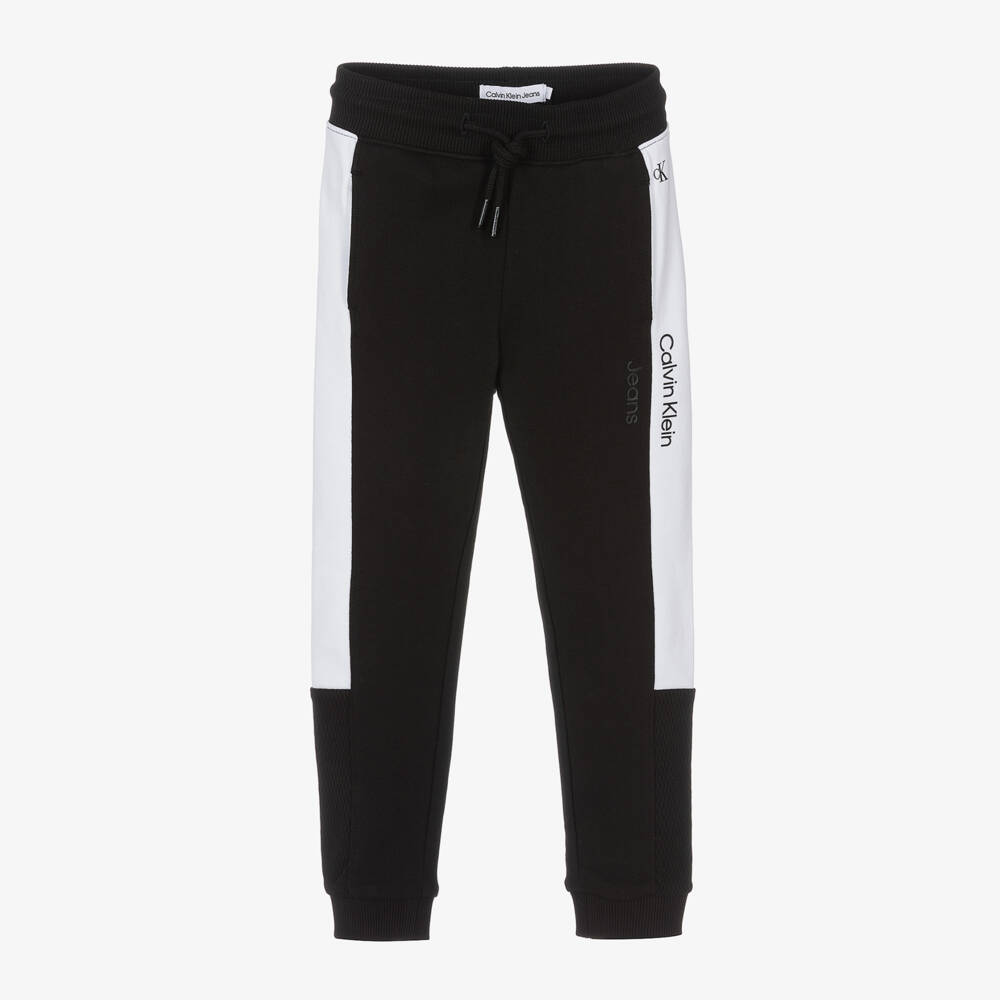 Casual and comfortable, these black cotton jersey joggers for boys are by American lifestyle brand Calvin Klein. They have white side panels, with the designer's name displayed vertically on one side, and a small CK monogram printed at the hip. They have an elasticated drawstring waist for an ideal fit, with useful front seam pockets, and black mesh jersey trims at the bottom of the legs.