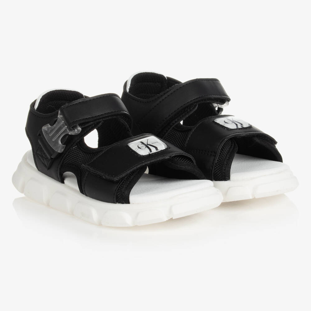 Sporty black sandals for boys by Calvin Klein Jeans. The front straps are made from faux leather and soft mesh with a raised resin logo patch. There is a contrasting white pad on the back and an ankle strap with velcro and a transparent plastic press buckle for optional fastenings. The white insole has a cushioned feel for added comfort and the logo branded outsole has chunky, ridged tread for improved grip and an edgy look.