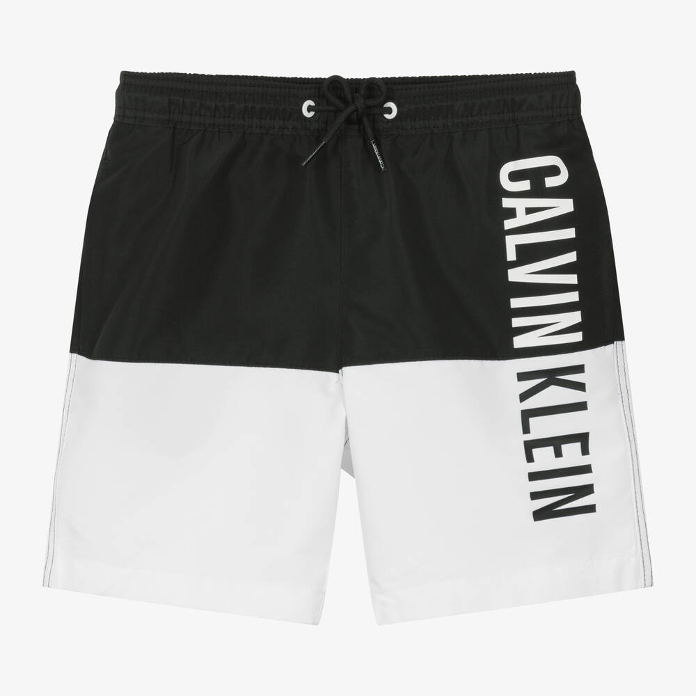 Black and white swim shorts for boys by American designer Calvin Klein, with a bold logo print on the front. Using recycled material, they are made in water repellent fabric for quick drying, with a soft mesh lining. The waistband is comfortably elasticated and has drawstring ties for an ideal fit. There are useful side seam pockets, with an additional velcro-fastening pocket on the back.