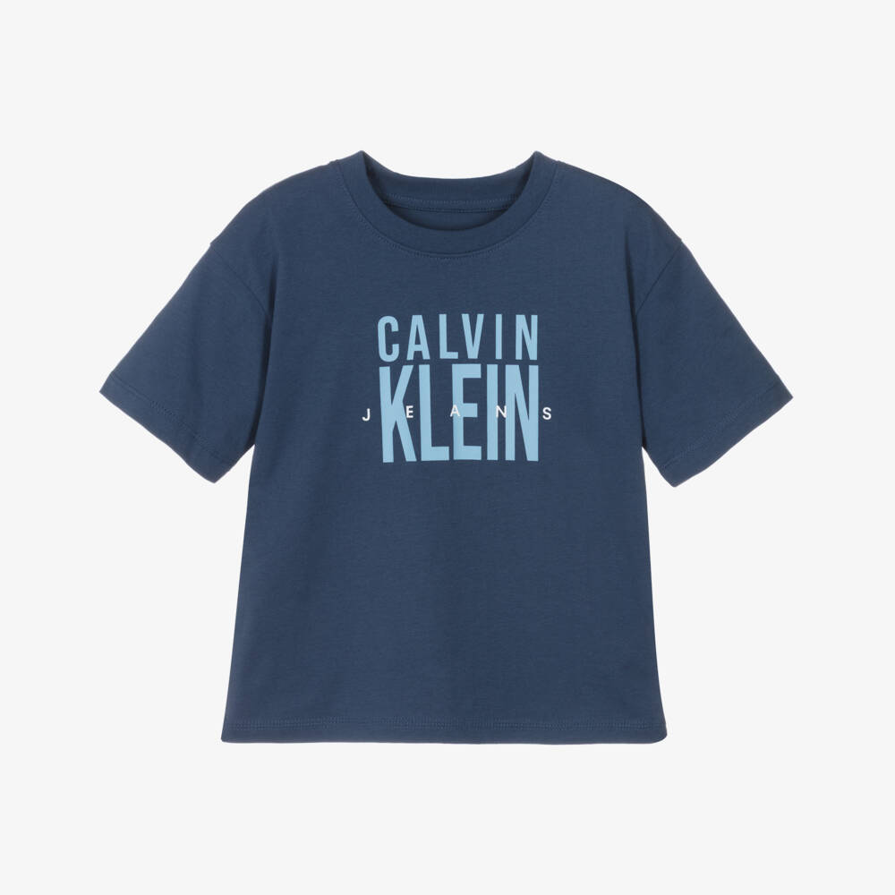 Boys blue T-shirt by Calvin Klein, with a striking logo print. Made from soft organic cotton, this jersey tee ensures comfort and breathability on casual days.