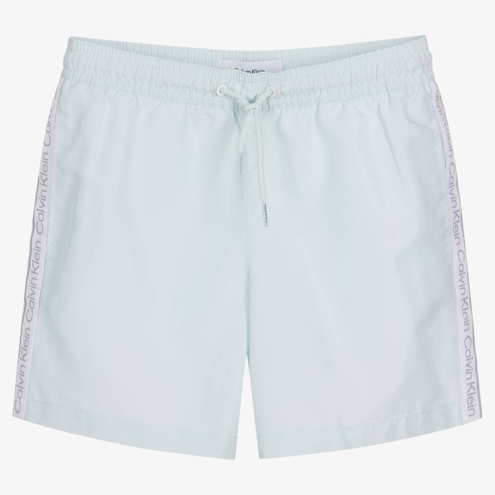 Boys ice blue swim shorts from Calvin Klein. For instant brand recognition, white and blue embroidered logo tape runs along the sides from the elasticated waist to the hem. Silky-soft and woven in water-repellent and quick-drying fabric, these lightweight shorts are made with recycled materials. They have a branded drawstring on the waist for a good fit, side pockets and a soft and comfortable mesh lining.