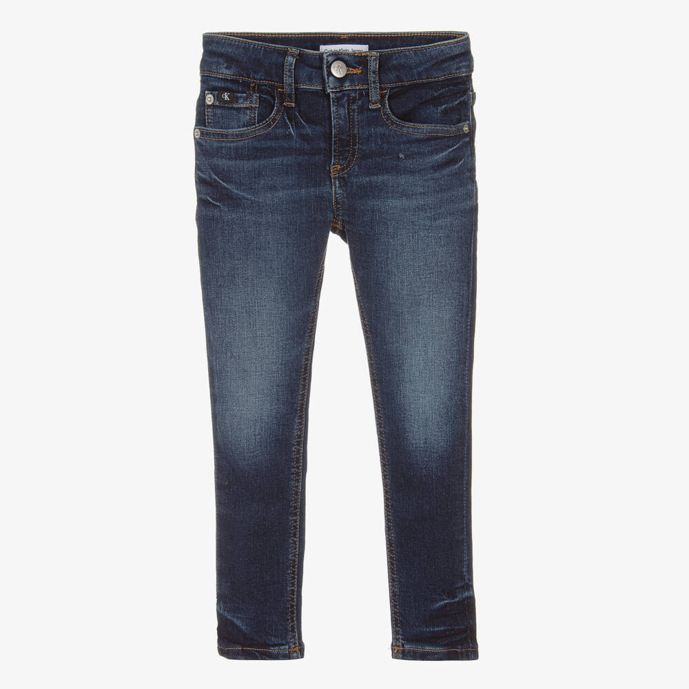 Dark blue jeans for boys by American brand Calvin Klein, made from soft cotton denim with a hint of stretch. Designed to sit on the waist, they have a slim fit through the hip and thigh with a skinny fit on the leg. They have an adjustable waistband for a desirable fit. The brand's monogram logo is engraved on the button fastening and can also be seen on the coin pocket and waistband badge on the back. Mustard yellow topstitching completes the authentic look.
