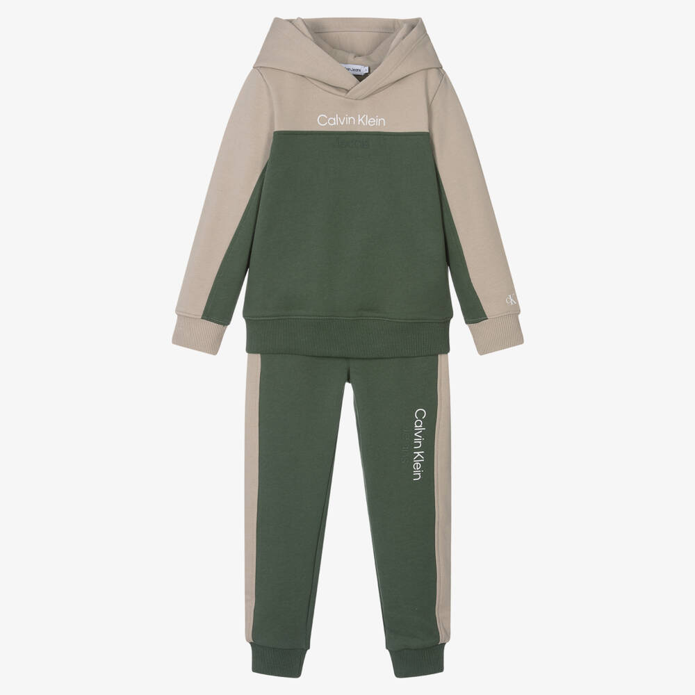 This cotton tracksuit for boys from Calvin Klein is panelled in beige and khaki green colour blocking. Both pieces are made in soft, medium-weight jersey for endless comfort. The hoodie has a white and tonal green logo print on the front and a monogram on the sleeve, adding those subtle designer elements. With ribbed cuffs for shape, the joggers have matching branding on one leg, hidden side pockets, and an elasticated waist with drawstrings, ensuring the ideal fit.