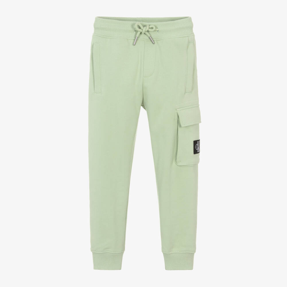 Celadon green cargo joggers for boys by Calvin Klein, made from mid-weight cotton jersey with ribbed knit trims. As part of any casual outfit, these comfortable trousers have an easy drawstring waistband and secure zip pockets on the front for carrying belongings. There is a flap pocket on one leg, branded with a black and white Calvin Klein Jeans logo.
