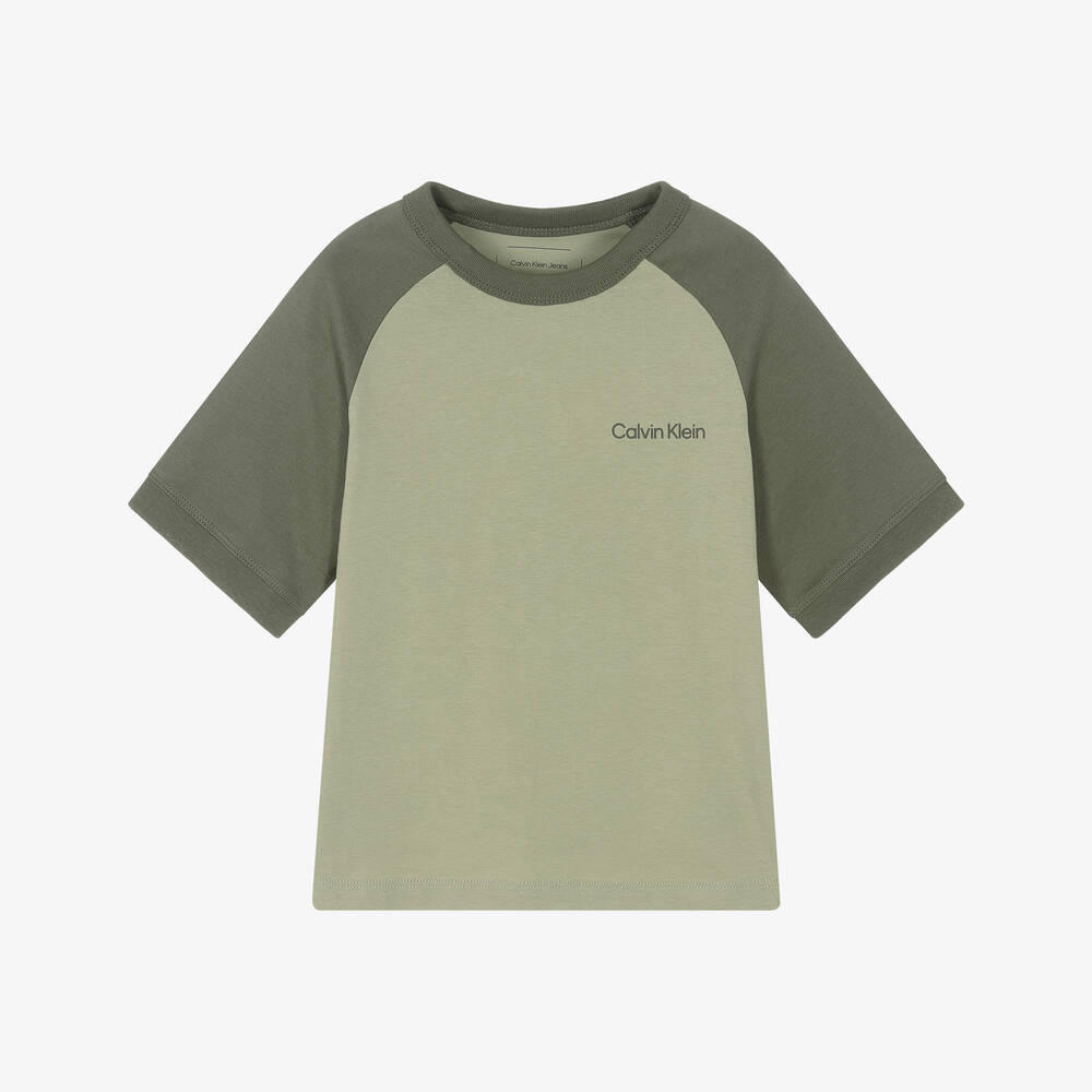 Green colourblock T-shirt for boys by Calvin Klein, with a signature logo print on the chest. In a comfortable relaxed fit, this raglan sleeve tee is made soft organic cotton jersey.
