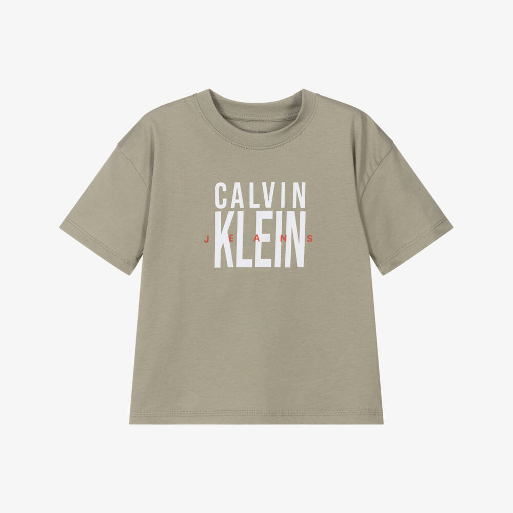 Boys olive green T-shirt by Calvin Klein, with a striking logo print. Made from soft organic cotton, this jersey tee ensures comfort and breathability on casual days.