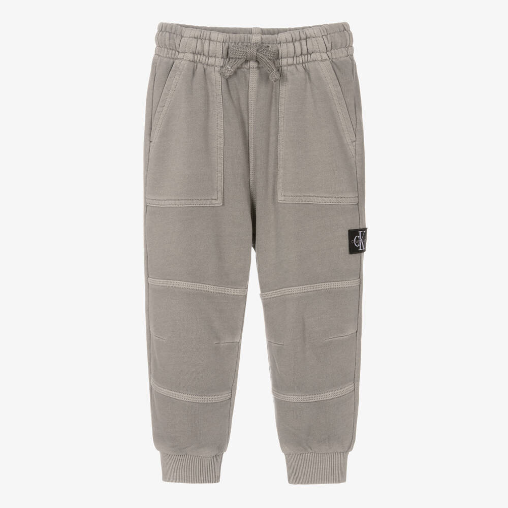 Grey joggers for boys by Calvin Klein, made from soft mid-weight cotton jersey. In a relaxed and minimal style, they have been coloured using mineral dyes for an authentically worn appearance and have seam details on the knees. There is a black Calvin Klein monogram patch on one side, slanted pockets on the front, and an elasticated drawstring waist for a comfortable fit.