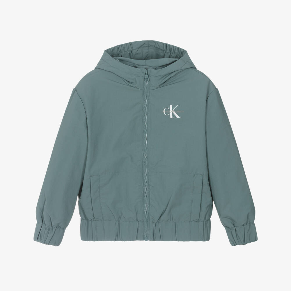Blue-grey hooded jacket for boys by Calvin Klein. Soft, smooth and lightweight, it has a white monogram logo on the front and deep, elasticated trims on the cuffs and hem. The outer material is made with at least 95% recycled nylon, whilst the lining is made with at least 95% certified recycled polyester.