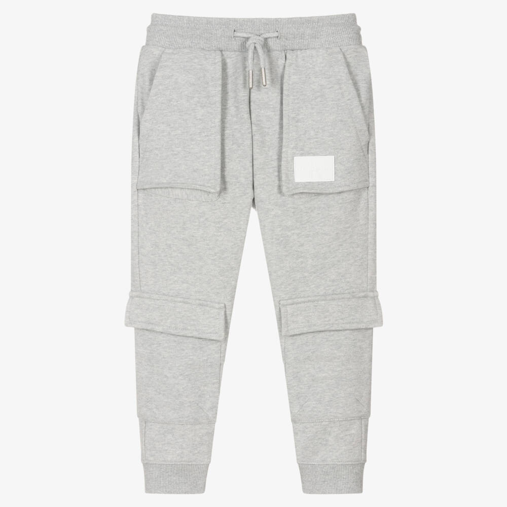 Grey marl joggers for boys by American designer Calvin Klein, made from soft, mid-weight cotton jersey. Easy to wear, these casual bottoms are designed with ribbed cuffs and an adjustable, drawstring waistband. They have roomy pockets on the front, one of which is highlighted with a rubberised Calvin Klein monogram logo. The utility-style flap pockets on the legs fasten securely with velcro.