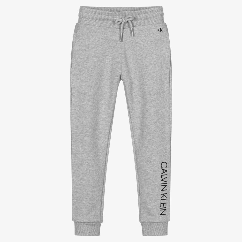 Grey organic cotton joggers for boys by Calvin Klein Jeans. Made with soft and stretchy sweatshirt jersey, the designer's logo can be found on one leg in black, with monogram branding on the front and a box logo on the back pocket. There is a drawstring on the comfortable elasticated waist and two useful front pockets.