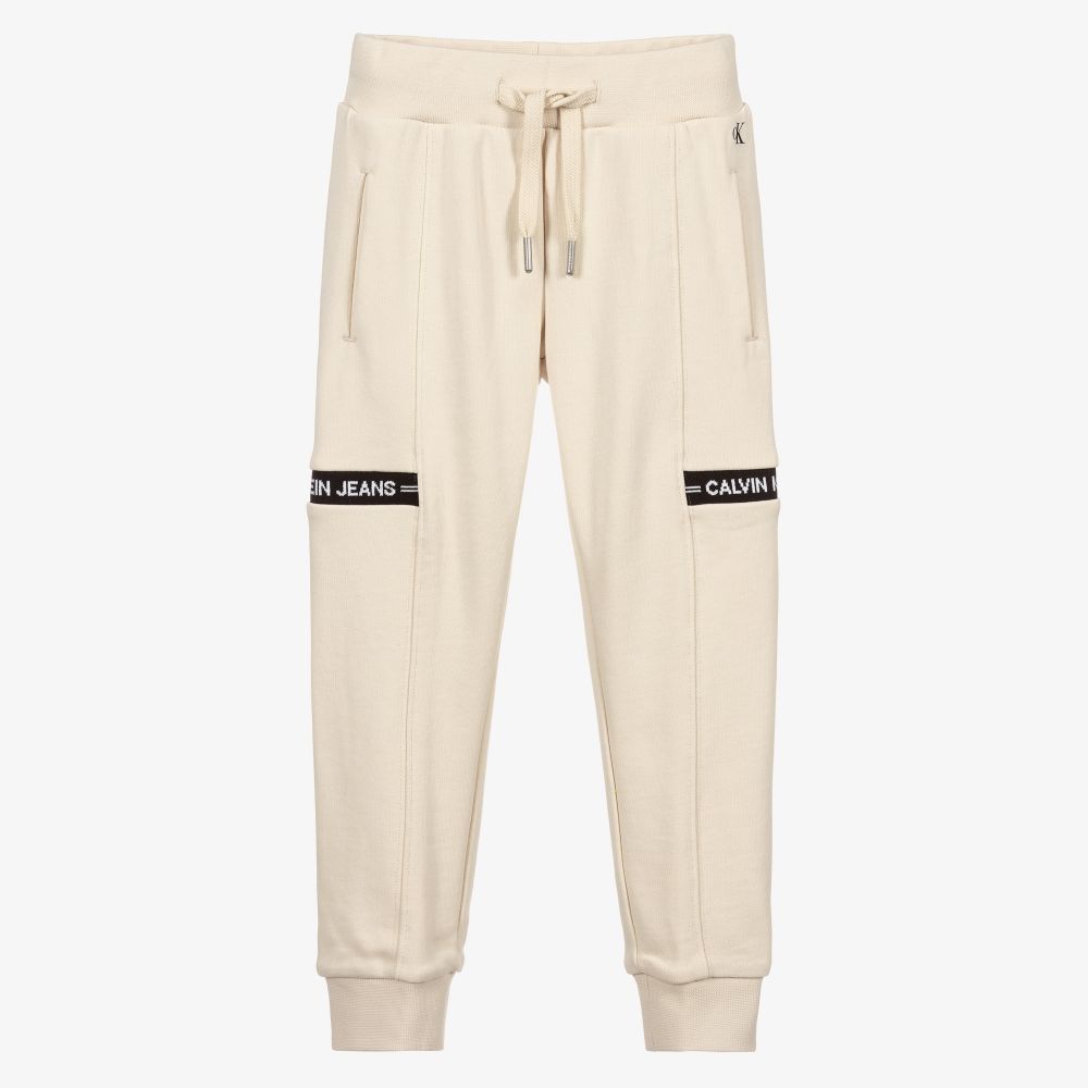 Ivory joggers for boys by American designer Calvin Klein Jeans, made in mid-weight sweatshirt jersey. They have a useful drawstring waistband, with the brand's logo printed on one side in black. There are ribbed black and white logo panels on the thighs.