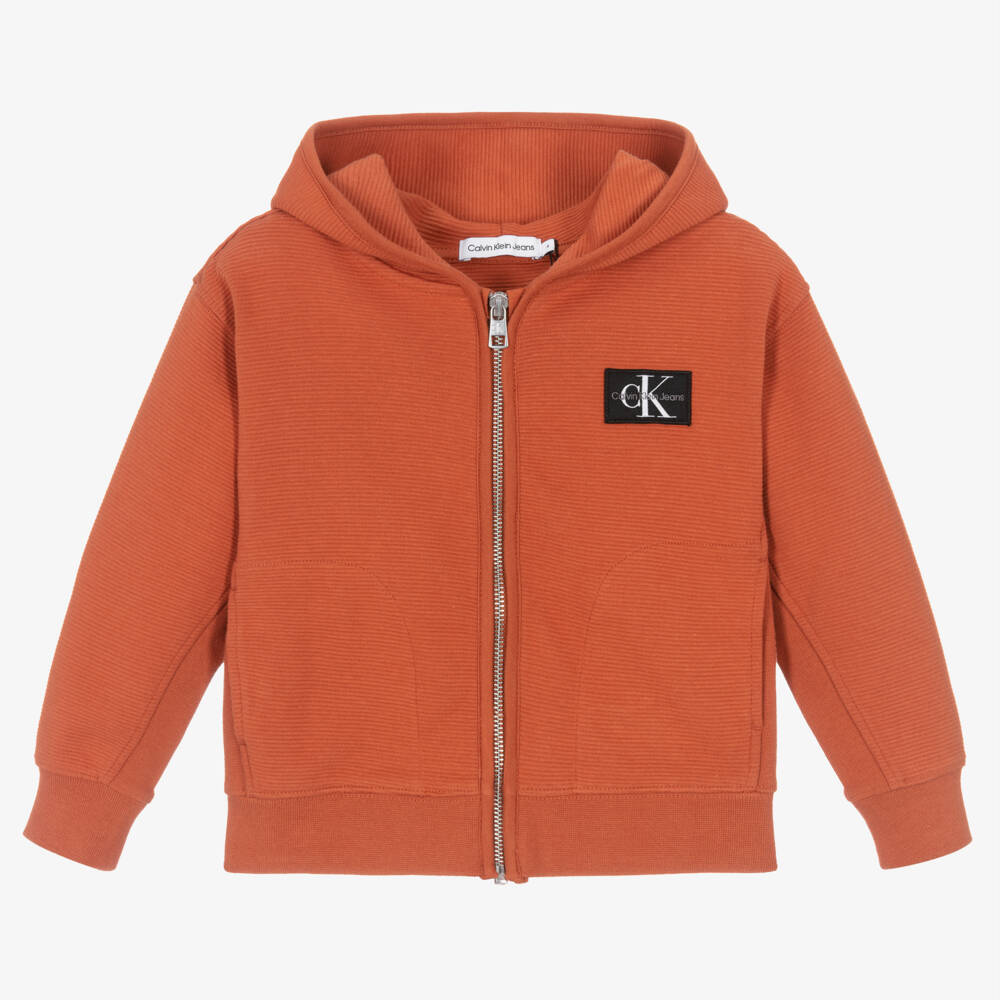 Rust orange zip-up hoodie for boys by American brand Calvin Klein, made in comfortable, ribbed cotton jersey. The top has a black and white logo badge sewn on one side, cosy ribbed trims and useful front pockets. It fastens with a silver zip that has a logo pull tab.