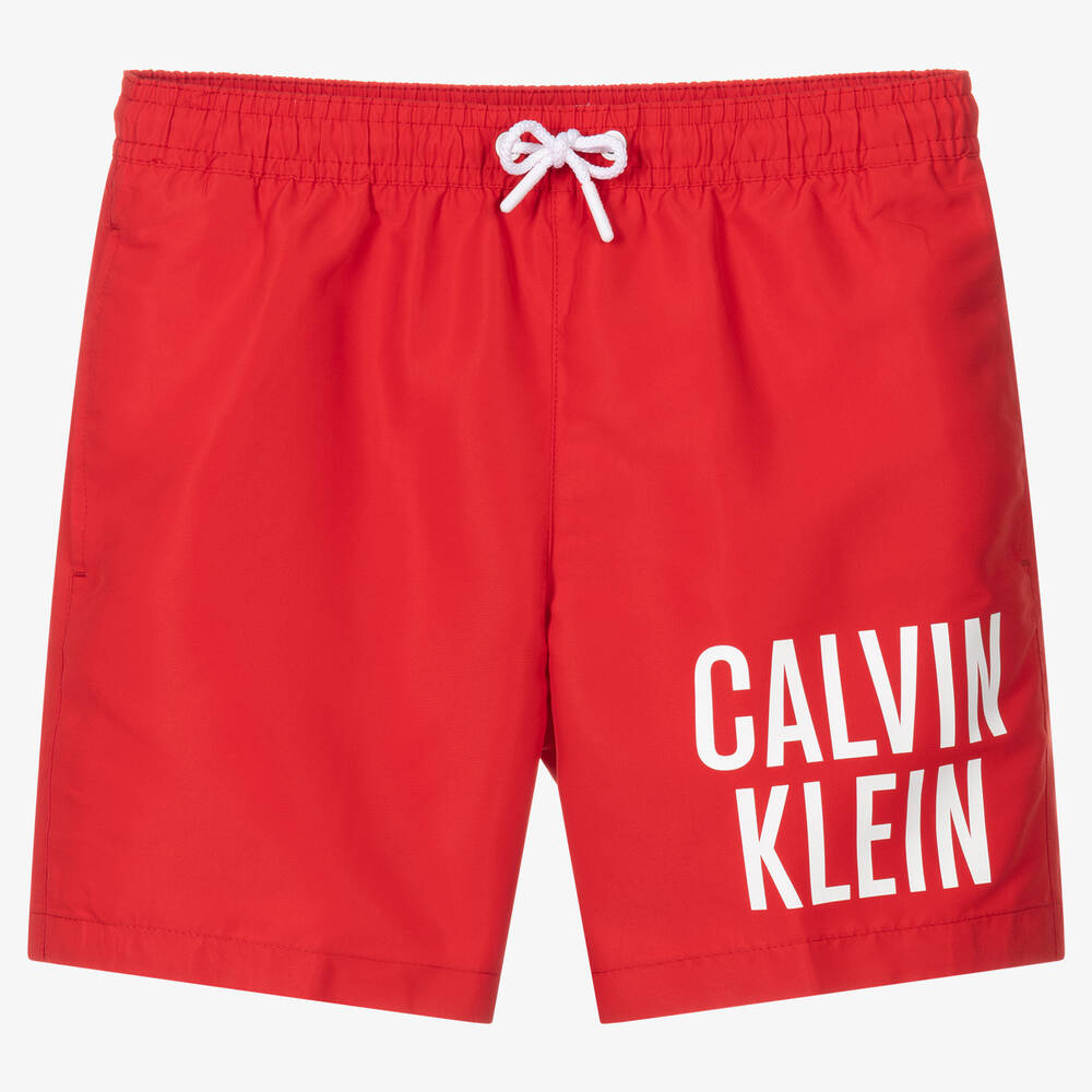 Red swim shorts for boys by Calvin Klein, with a bold white logo print. They are made from lightweight recycled polyester with a white mesh lining and are water-repellent for quicker drying. The elasticated waistband has an adjustable drawstring for a good fit and there are concealed side pockets and a velcro-fastening patch pocket on the back.