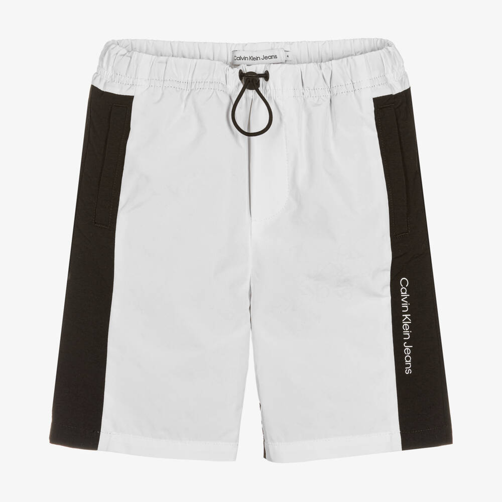 White and black shorts for boys by Calvin Klein Jeans, made from a smooth recycled fabric. In a cool monochromatic design, these shorts feature an monogram logo pattern which appears when exposed to sunlight, with a bold Calvin Klein Jeans logo on the side. They have useful side seam pockets, with a single back pocket, patched with the signature monogram logo. Great for casual wear, the adjustable toggle fastening offers the best fit around the waist.