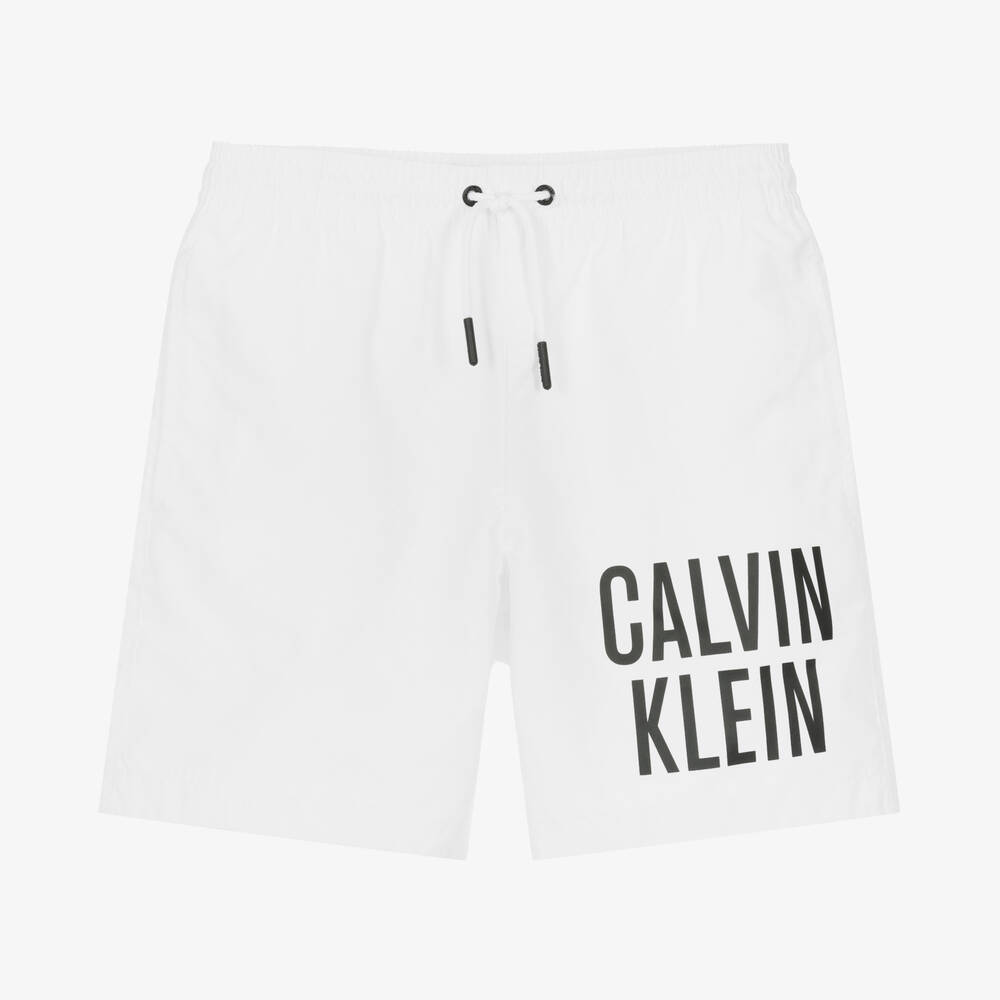 Boys white swim shorts by Calvin Klein. Made in recycled polyester, they have an adjustable drawstring at the front, side pockets and one on the back with velcro closure. A black logo print is on one leg and they have a mesh lining for comfort and support.