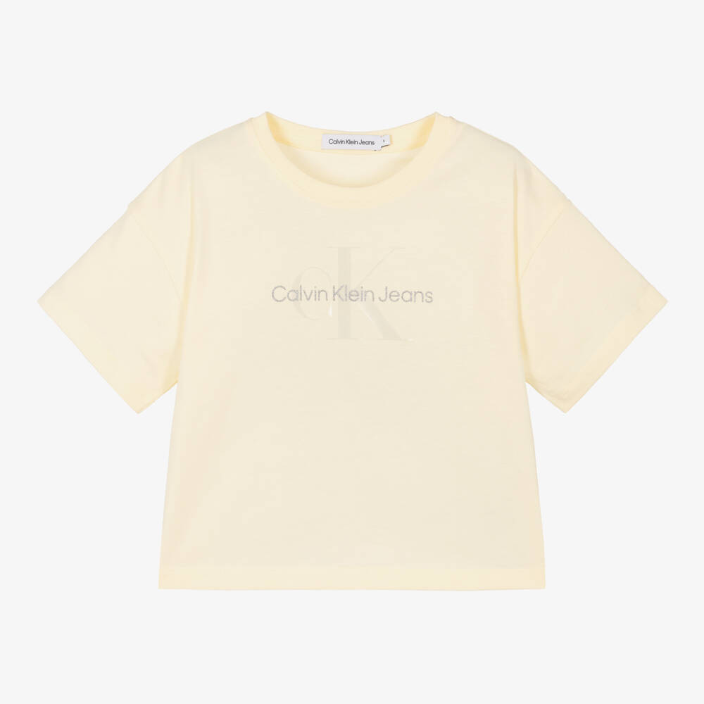 Ivory T-shirt for girls by Calvin Klein, made in soft cotton jersey. This boxy fit tee has the American label's iconic logos printed on the front, with a touch of silver glitter for added sparkle.