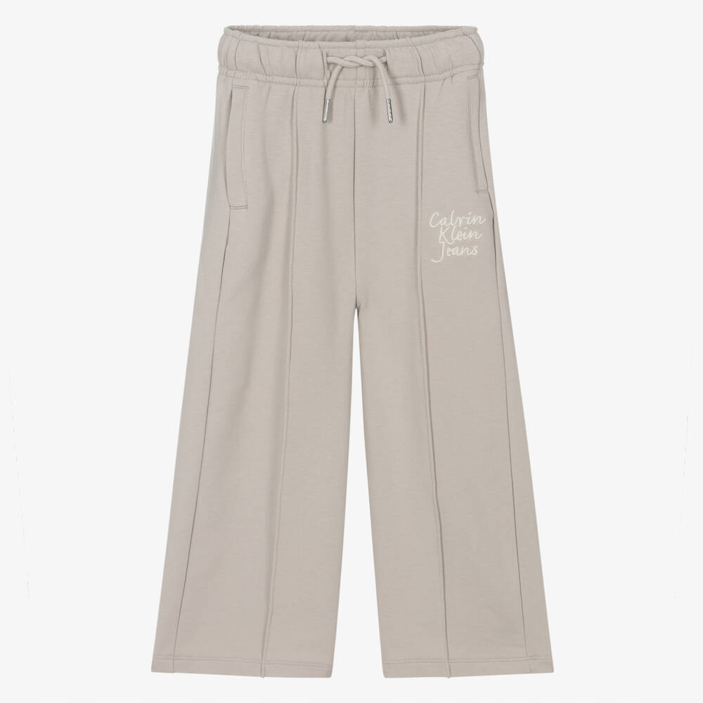 Stylishly casual, beige wide-leg joggers for girls by Calvin Klein, made in mid-weight cotton jersey. Soft and comfortable, they have a drawstring waistband and neat, side seam pockets. An ivory script logo is embroidered on one side for a distinctive designer finish.