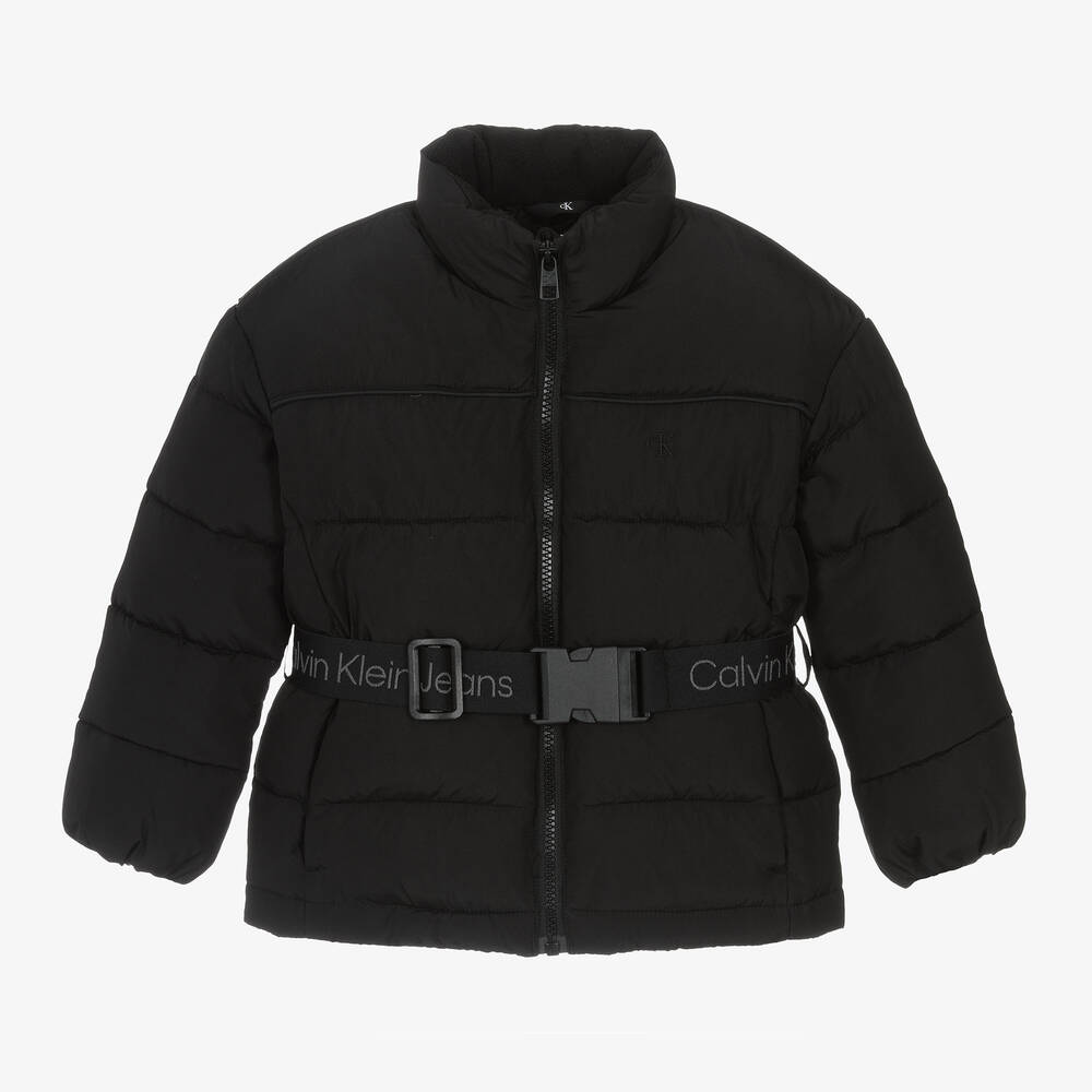 Black belted puffer jacket for girls by Calvin Klein, made in silky smooth fabric with mid-weight padding. Ensuring warmth during the colder months, this slim-fit design has a full zip front and long sleeves with elasticated cuffs. The stand-up collar is lined with cosy polar fleece and the silky interior is printed with a Calvin Klein Jeans logo. To shape the waist, the elasticated belt is fully adjustable and fastens with a branded clip buckle. A monogram logo, in tonal embroidery, adds further designer detail to the chest. The outer material and lining are made with at least 95% certified recycled material.