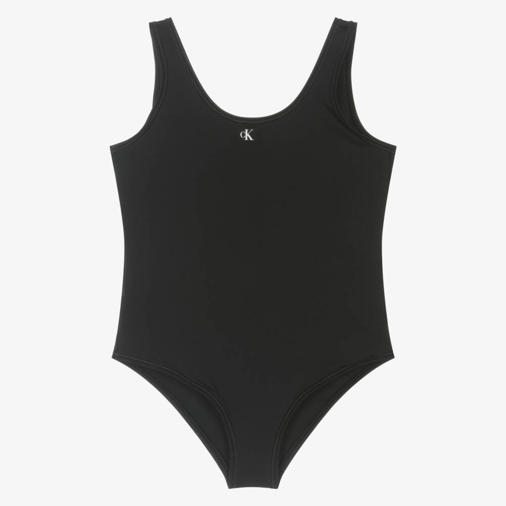 Black swimsuit for older girls by Calvin Klein, with a sleek and minimalistic design. Made from recycled material, the fabric is silky soft and stretchy, offering comfort and flexibility. Fully lined for comfort, it has a small CK monogram on the chest for a signature finish.