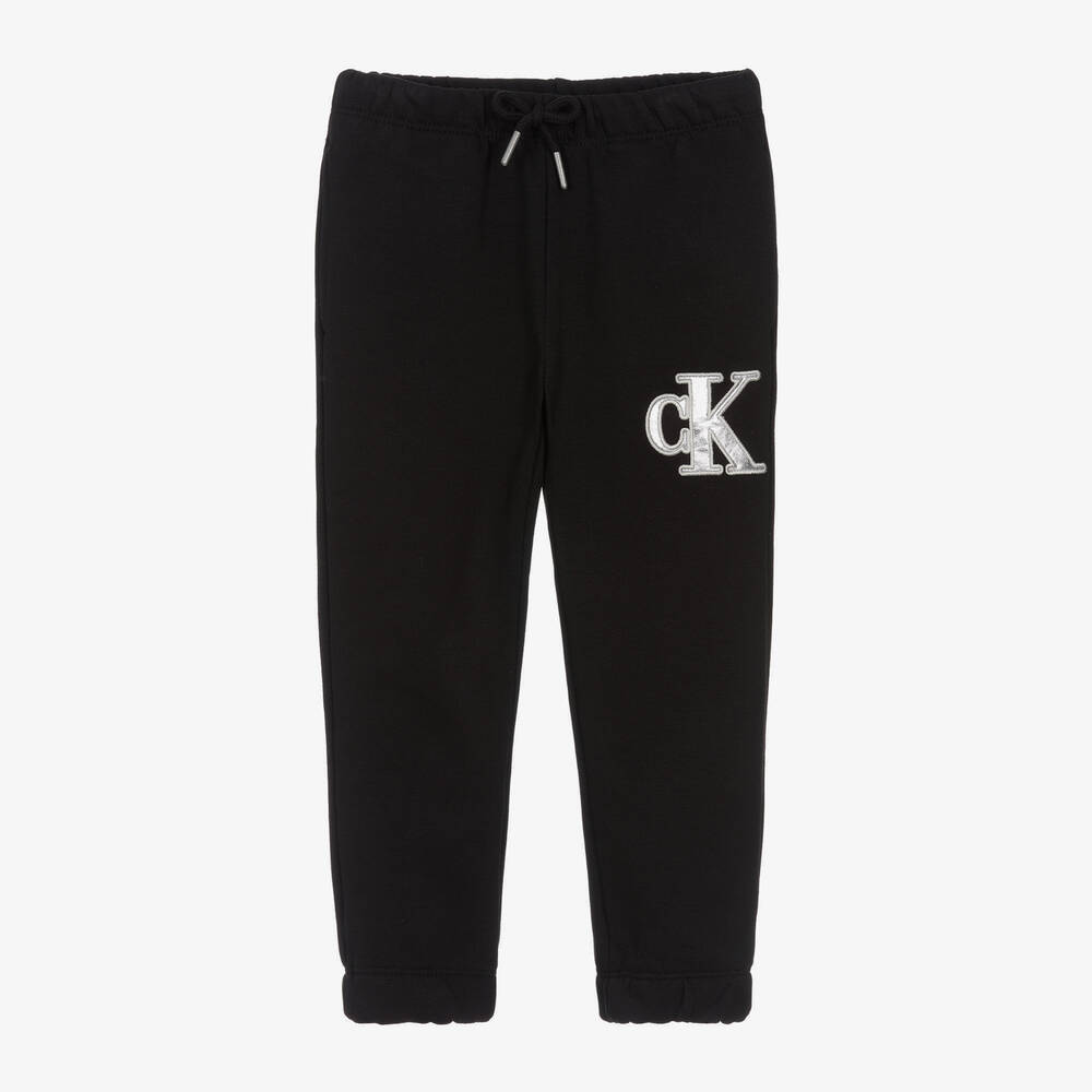Black joggers for girls by American brand Calvin Klein, made in soft and comfortable cotton jersey. They have an elasticated drawstring waist for an ideal fit, with elasticated ankles, side seam pockets, and an additional pocket on the back. There is a metallic silver CK monogram logo appliquéd on one side for a signature look.