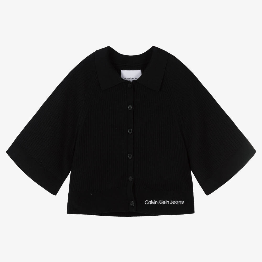 Sleek black cardigan for girls by Calvin Klein Jeans, made in a soft ribbed knit. Fastening with buttons, this collared cardigan has contrast white logo embroidery along the hem and is finished with contemporary three-quarter length wide sleeves.