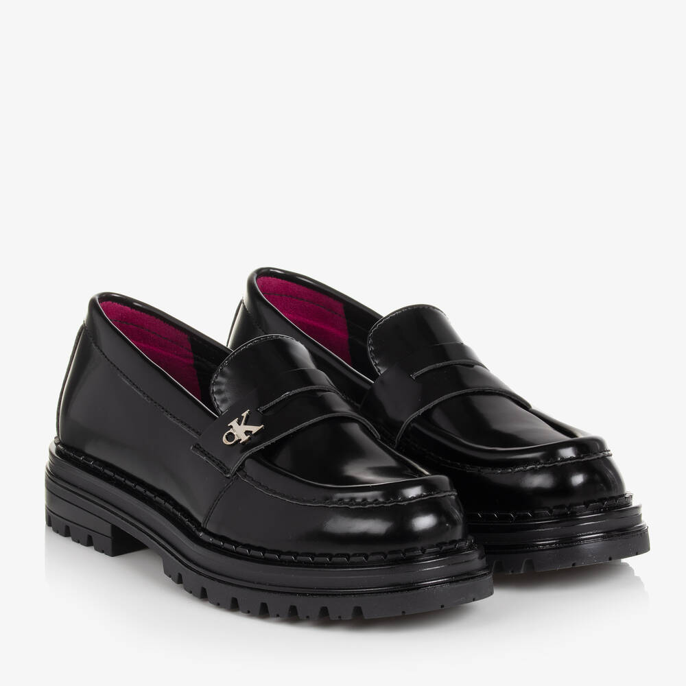 Classic black loafers for girls by Calvin Klein, made in shiny faux leather. Smart and stylish, they have a soft leather lining, cushioned insole and chunky non-slip rubber sole for a contemporary look. This easy slip on style is finished with the signature loafer tab across the front and a silver metal CK monogram detail.