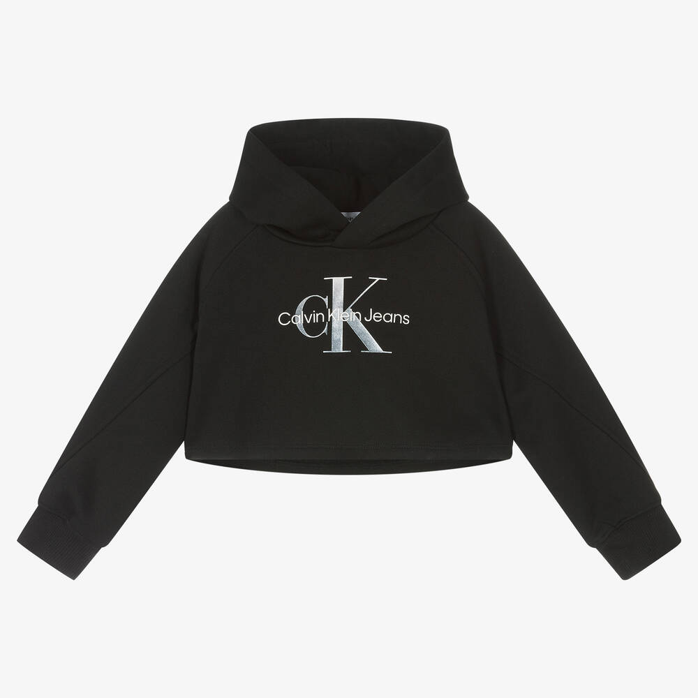 Cool black cropped sweatshirt for girls by Calvin Klein Jeans. Edgy and stylish in a boxy fit, this hooded top has a metallic silver ombre and white CK logo printed on the front. In a comfortable mid-weight cotton blend jersey with soft fleecy underside, this top is made with 43% REPREVE® recycled polyester.