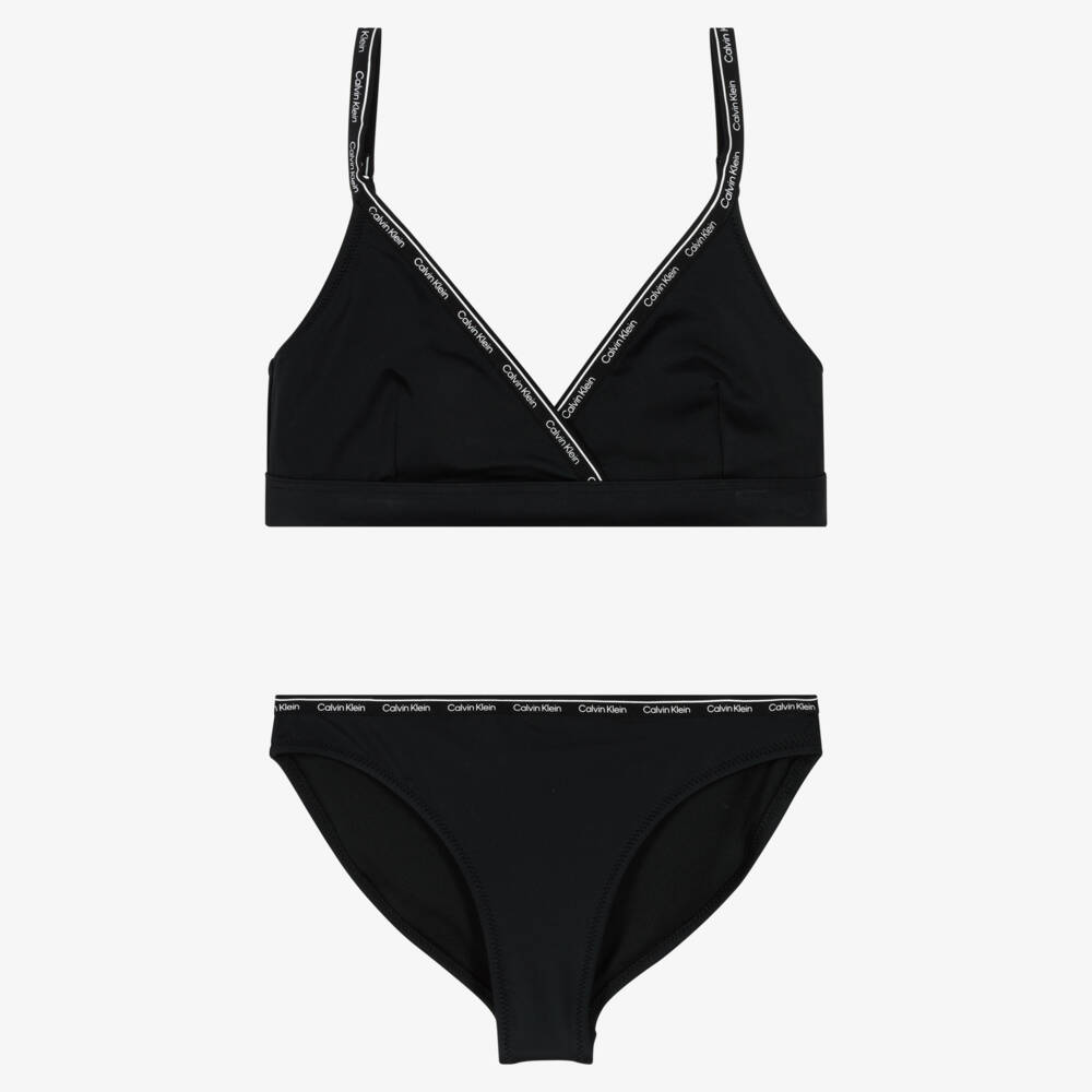 Stylish black bikini for girls by Calvin Klein. Using recycled nylon, it is made in stretchy lycra and fully lined for comfort. Lightly padded, the triangle top has adjustable shoulder straps, an elasticated underband, and logo tape trims. The bottoms have an elasticated waistband, with matching logo tape trim.
