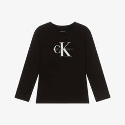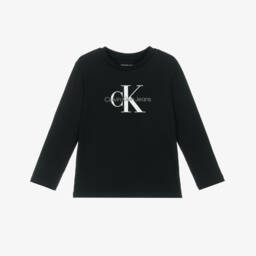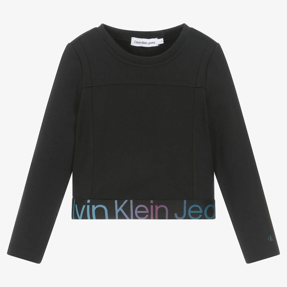 Black cropped top for girls by Calvin Klein, made in comfortable Milano jersey. It has seamed detailing on the front and a ribbed crew neckline. There is an elasticated logo tape hem with pink and blue lettering for a signature look, with small monogram logo printed on one sleeve. This garment is made with at least 50% LENZING ECOVERO viscose fibres.