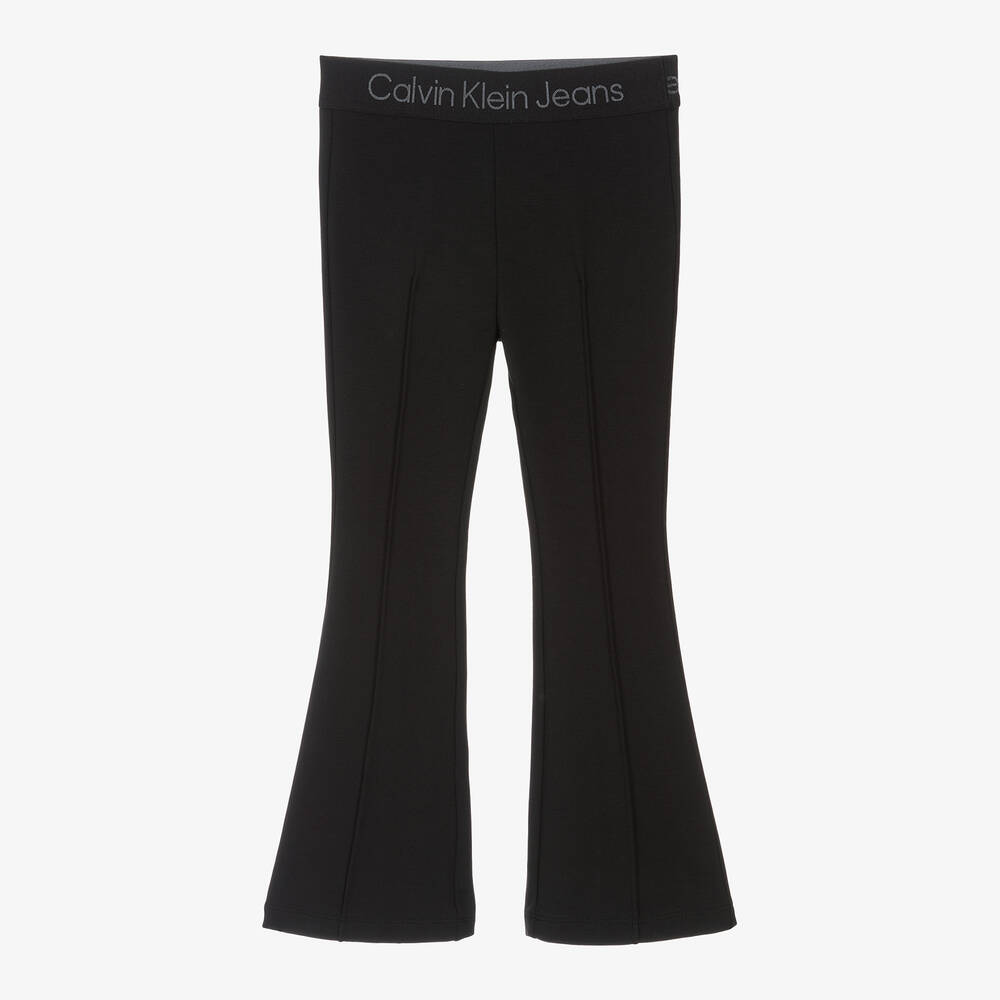 Black leggings for girls by Calvin Klein, knitted in heavier-weight Milano jersey. A timeless style, they have exposed seams on the front and back and slim legs that flare out at the hems. The elasticated tape waistband is branded with a repeat Calvin Klein Jeans logo for a combination of style and comfort.
